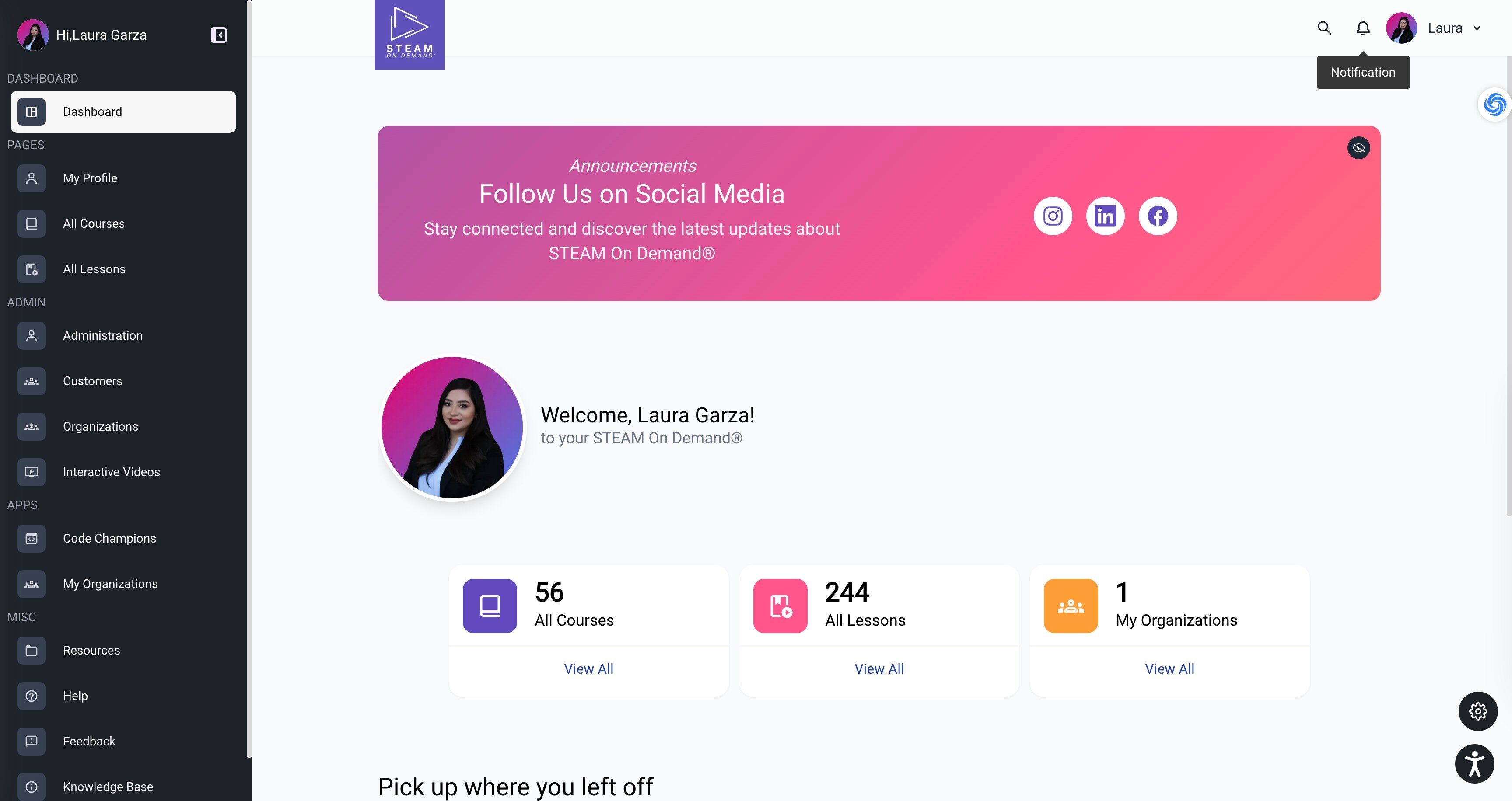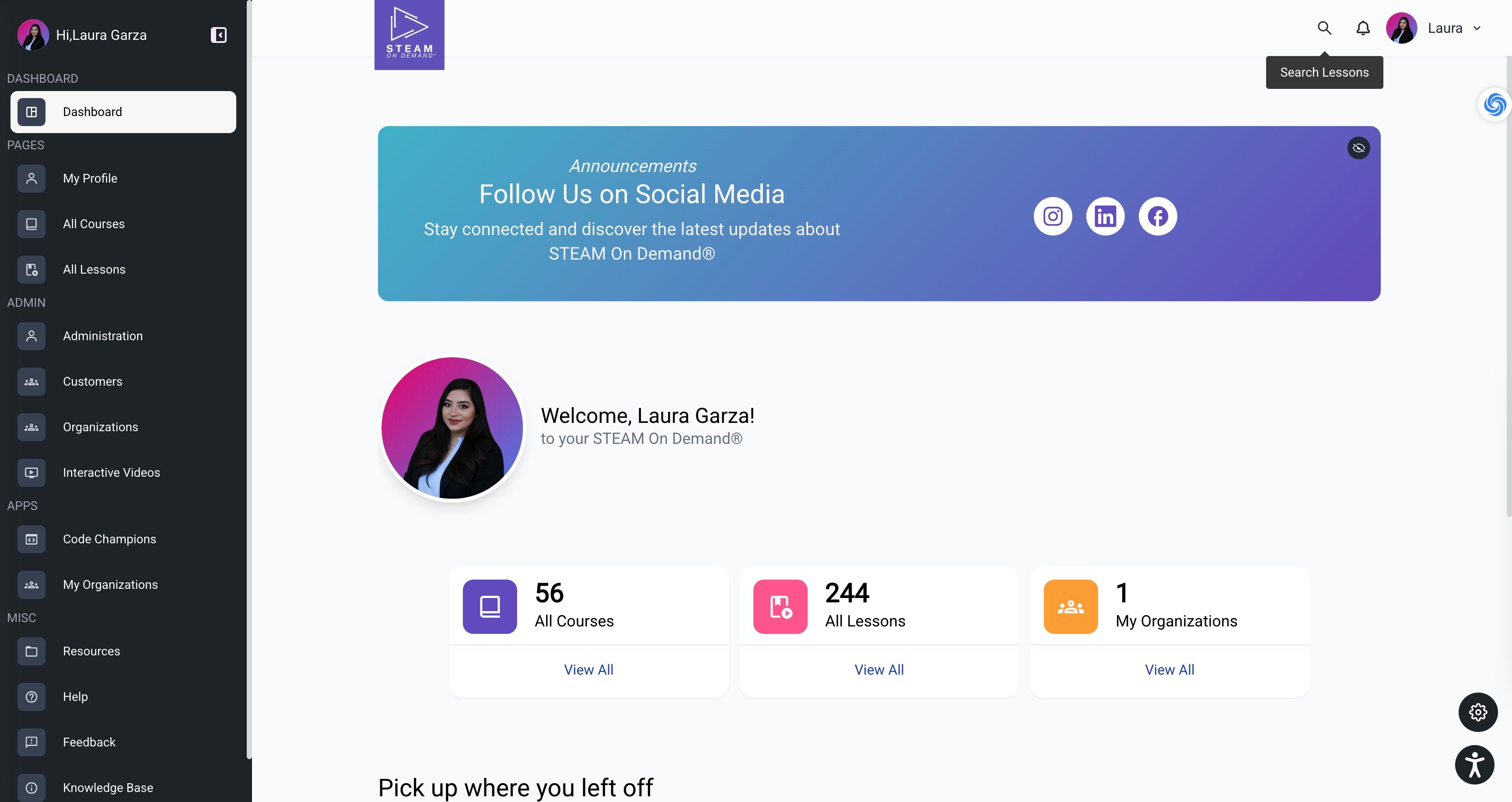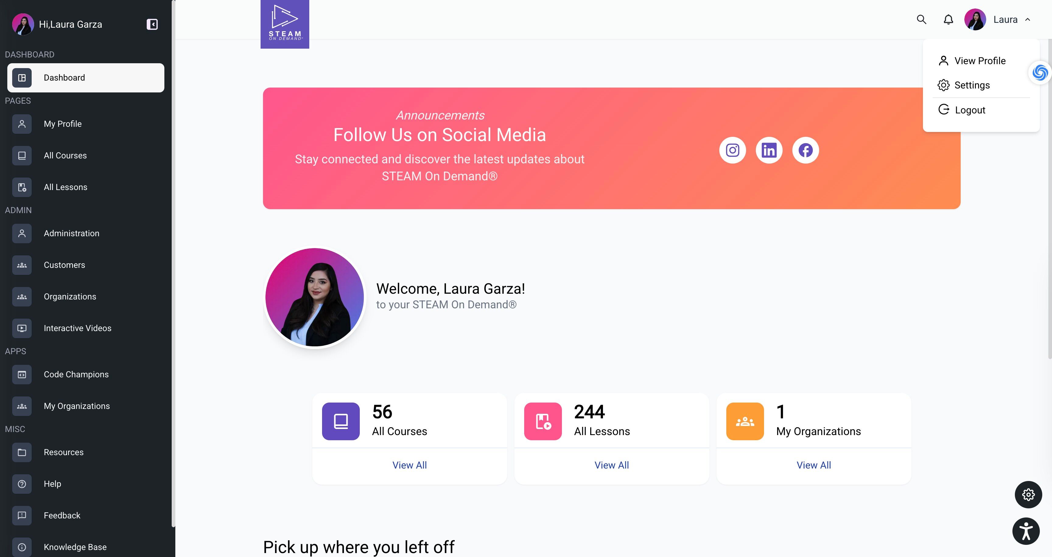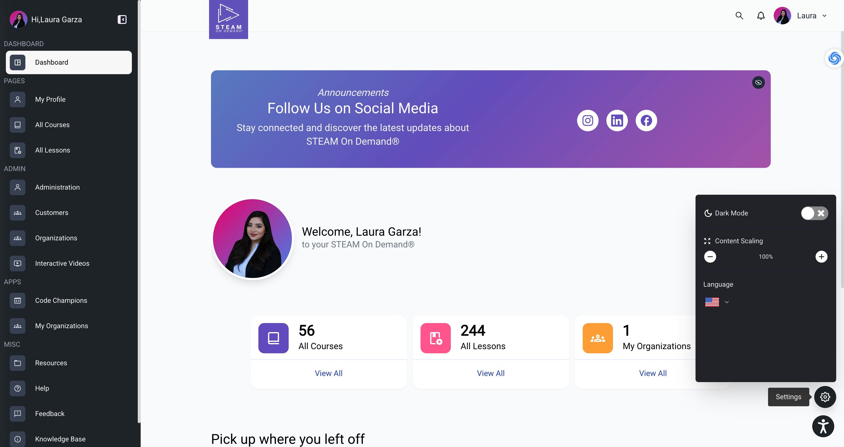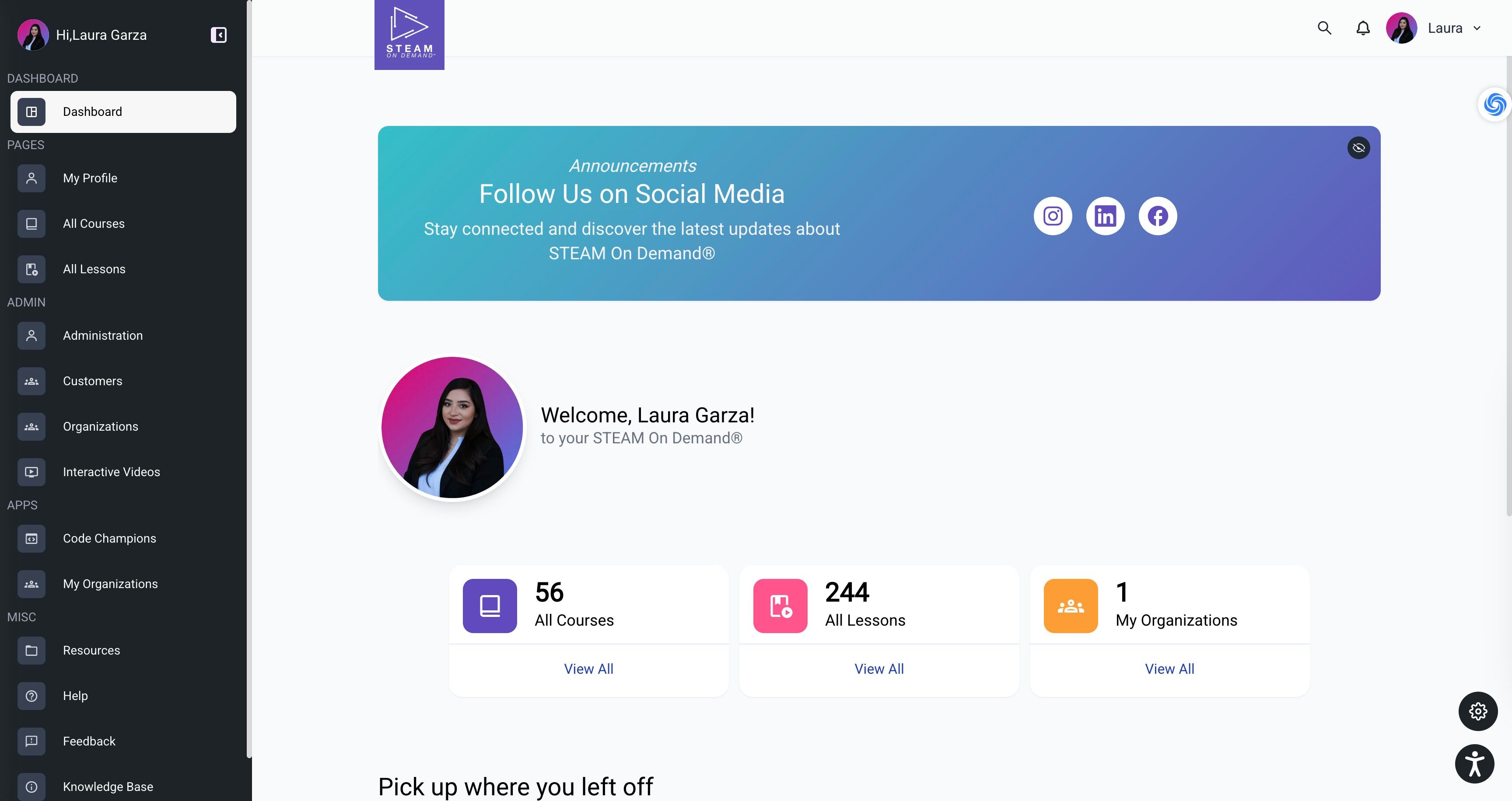 2. The dashboard is your central hub, providing shortcuts to key resources. A banner at the top displays important messages, such as updates and social media connections for STEAM On Demand.