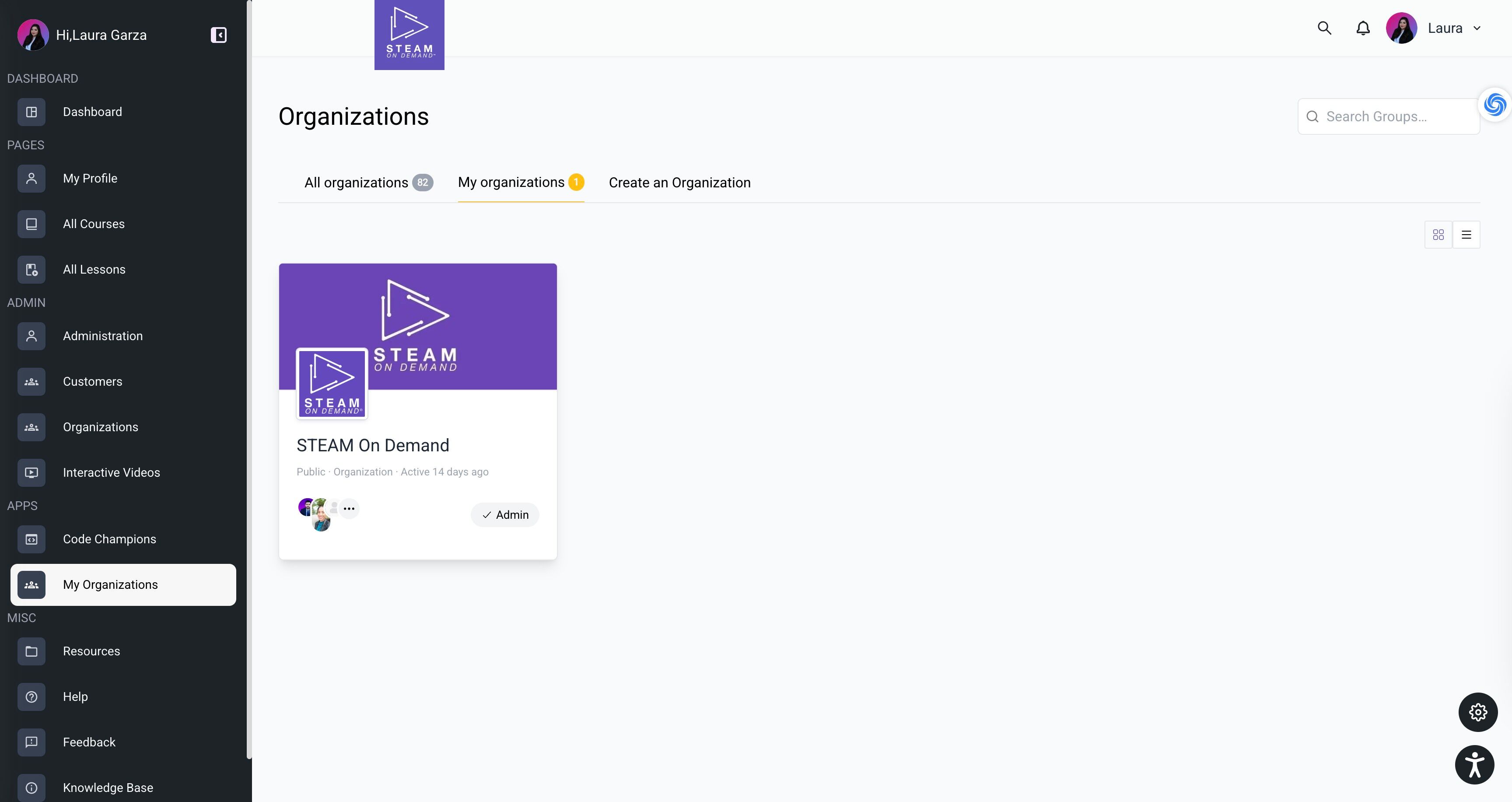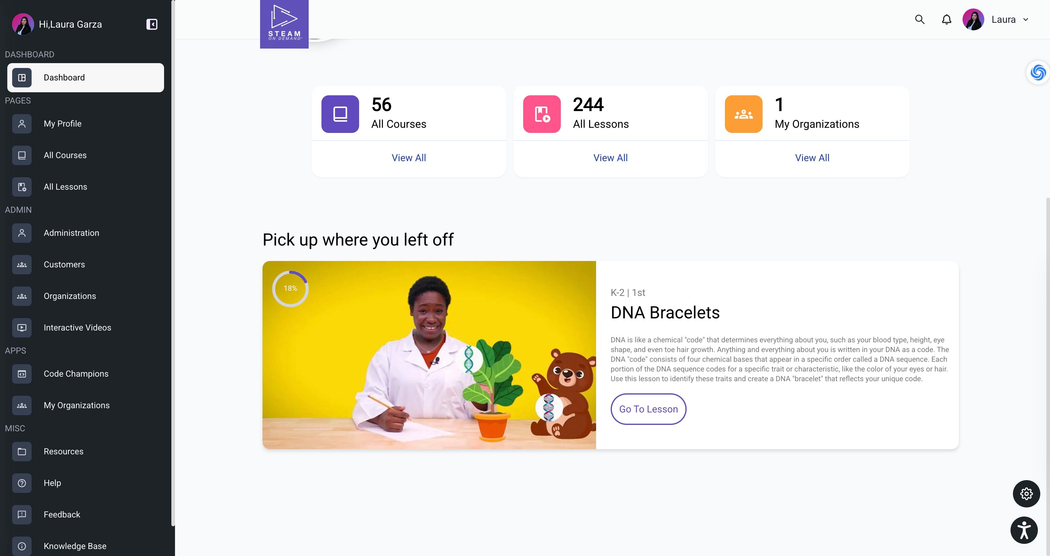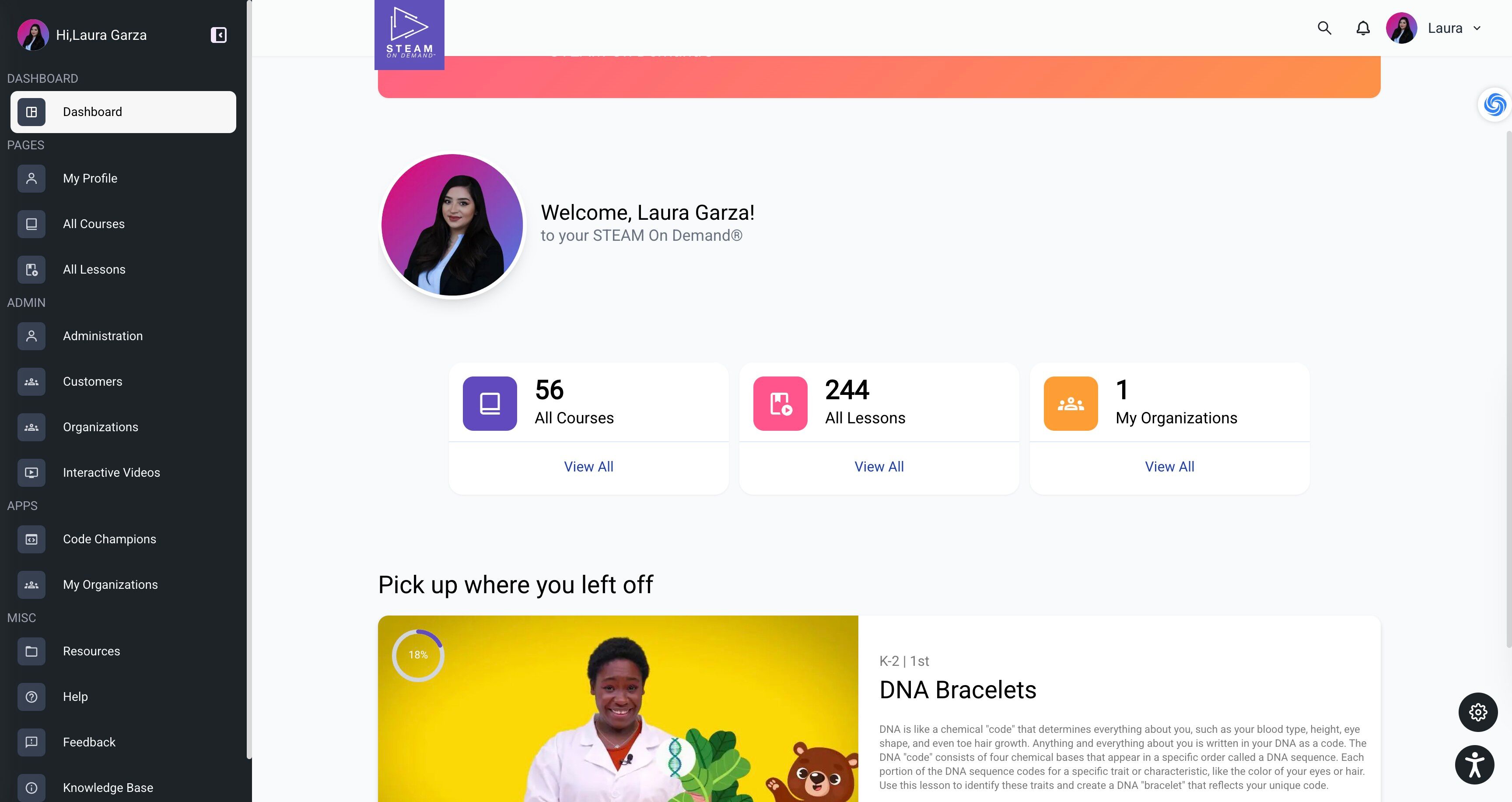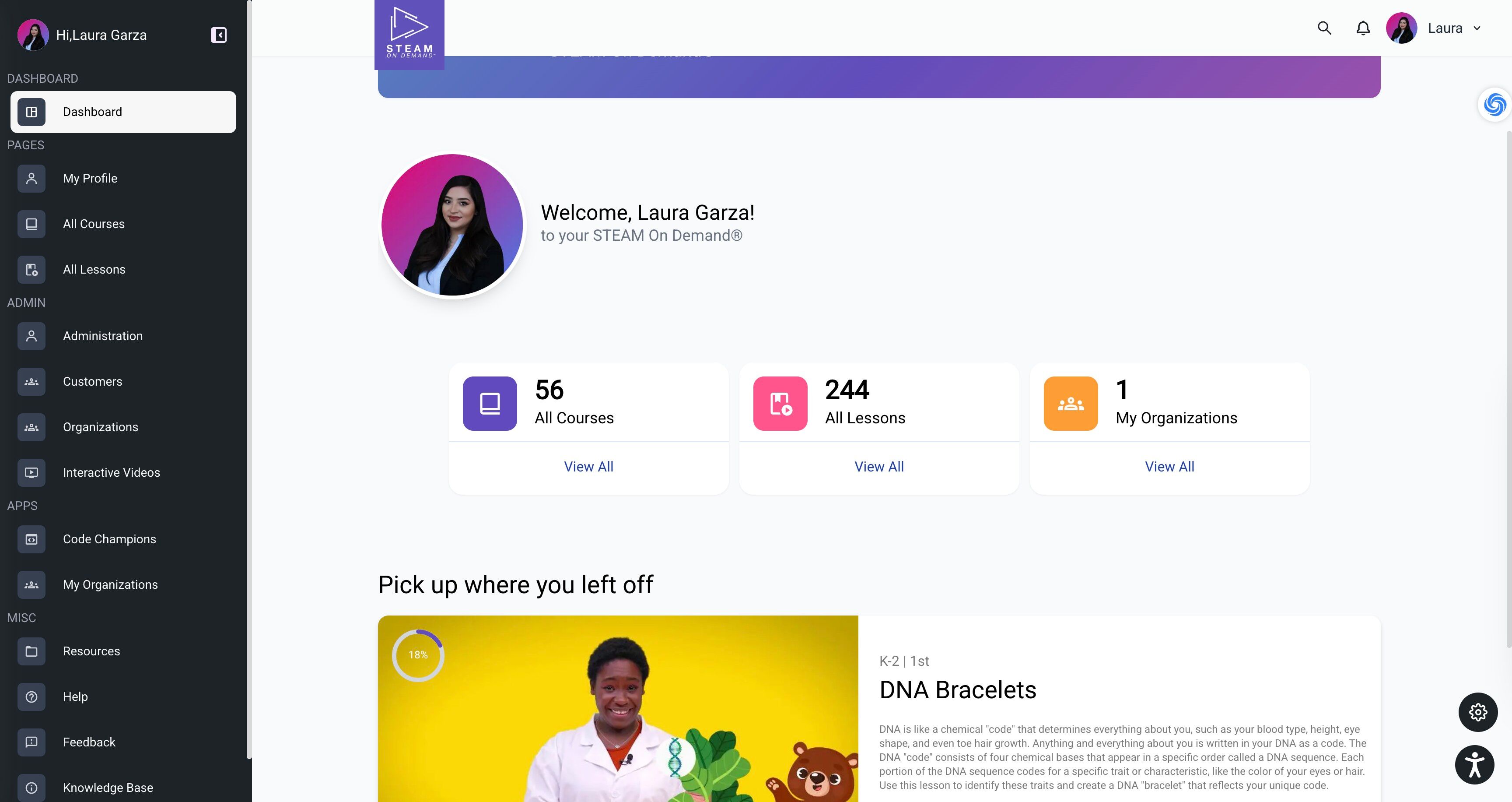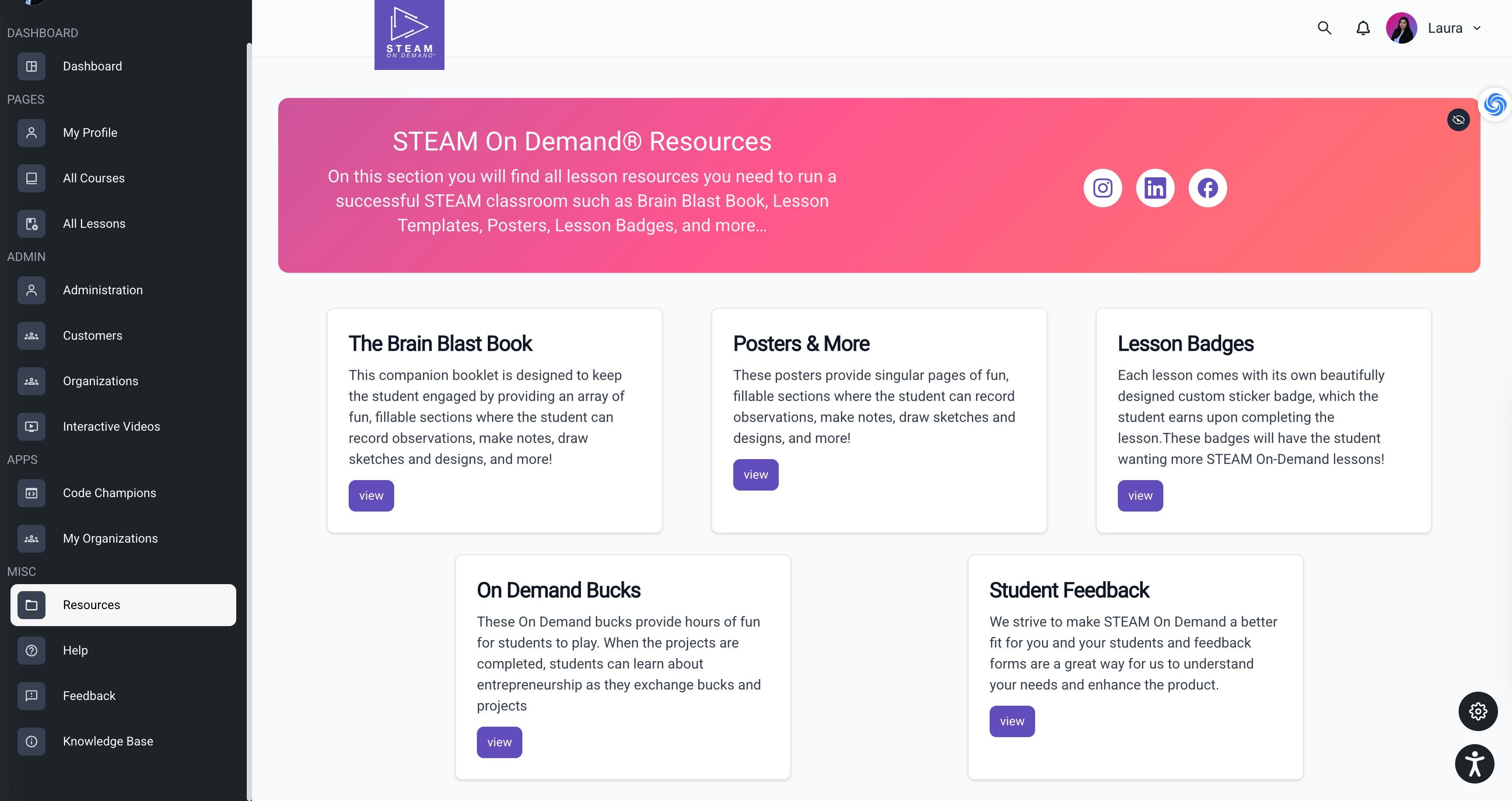 2. The dashboard is your central hub, providing shortcuts to key resources. A banner at the top displays important messages, such as updates and social media connections for STEAM On Demand.