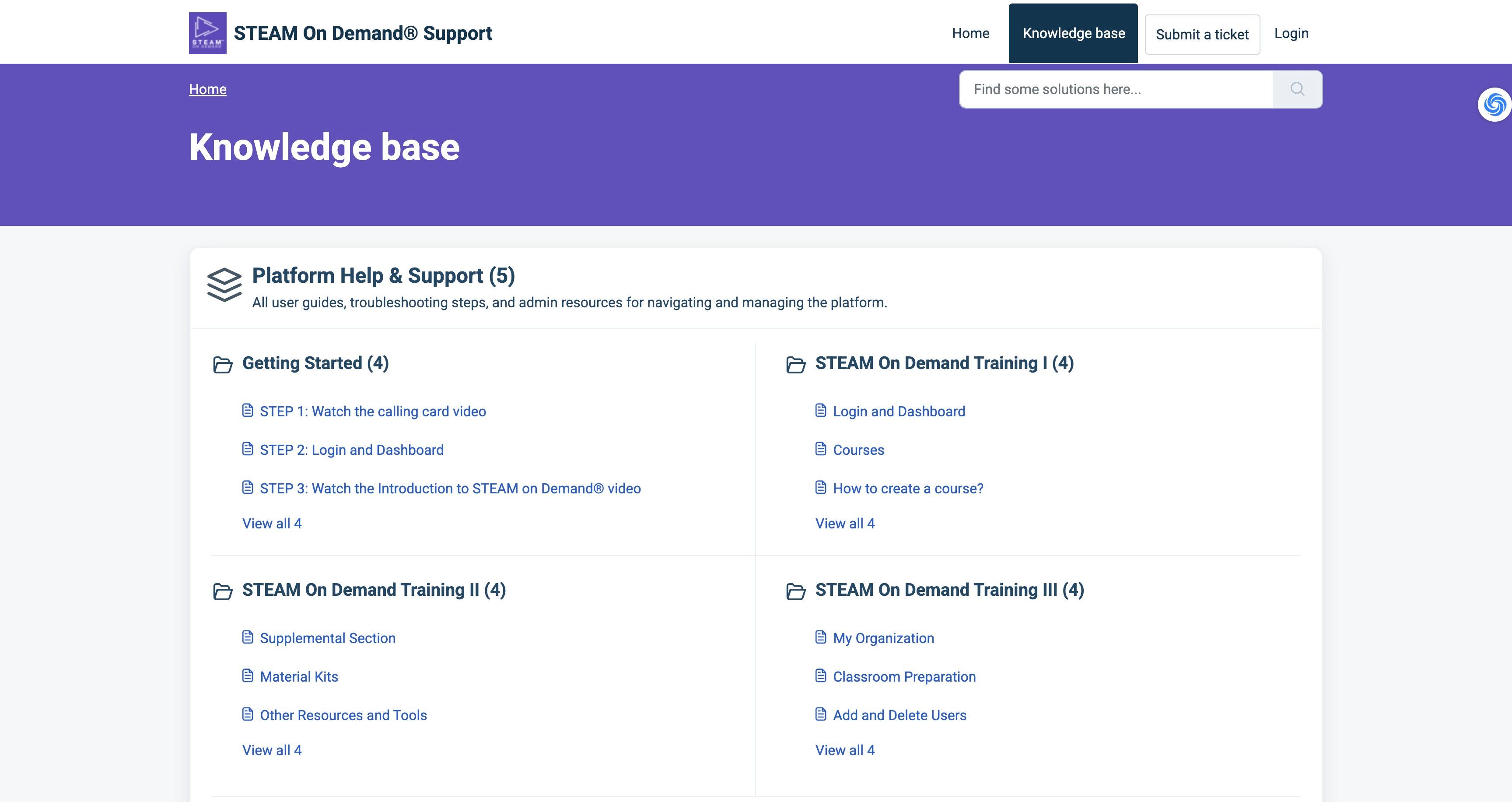 19. Access the Knowledge Base for additional training and guidance. To return to the dashboard, click "Home" or the STEAM On Demand logo.